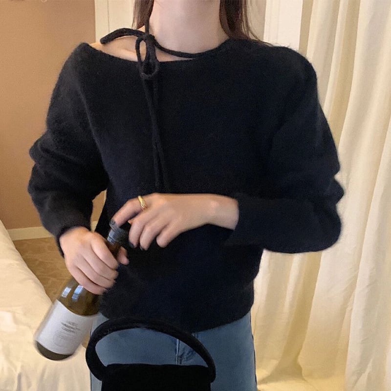 さりげない肩見せで抜け感を演出する、韓国きれいめムードのニットトップス。