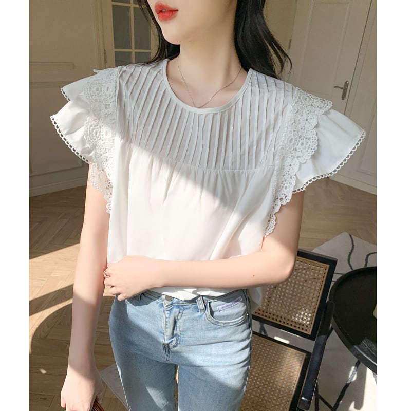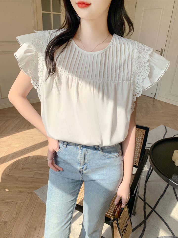 繊細なレースとプリーツデザインが上品な印象を与える、韓国きれいめスタイルのブラウス。