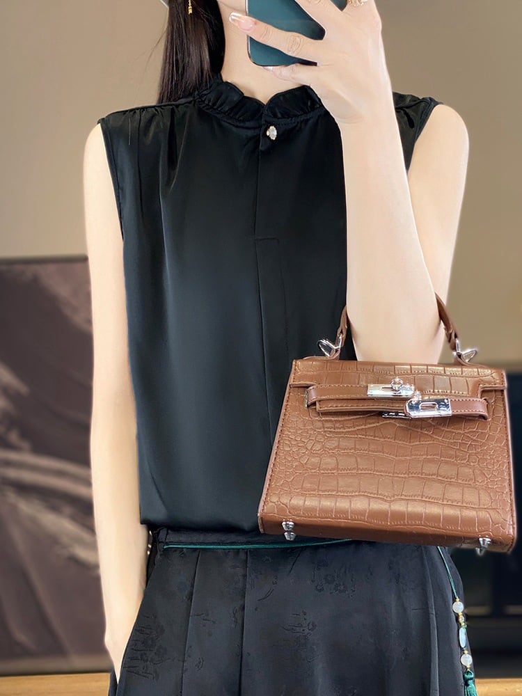 上品なサテン素材と、さりげないフリルネックが女性らしい印象を演出するノースリーブブラウス。