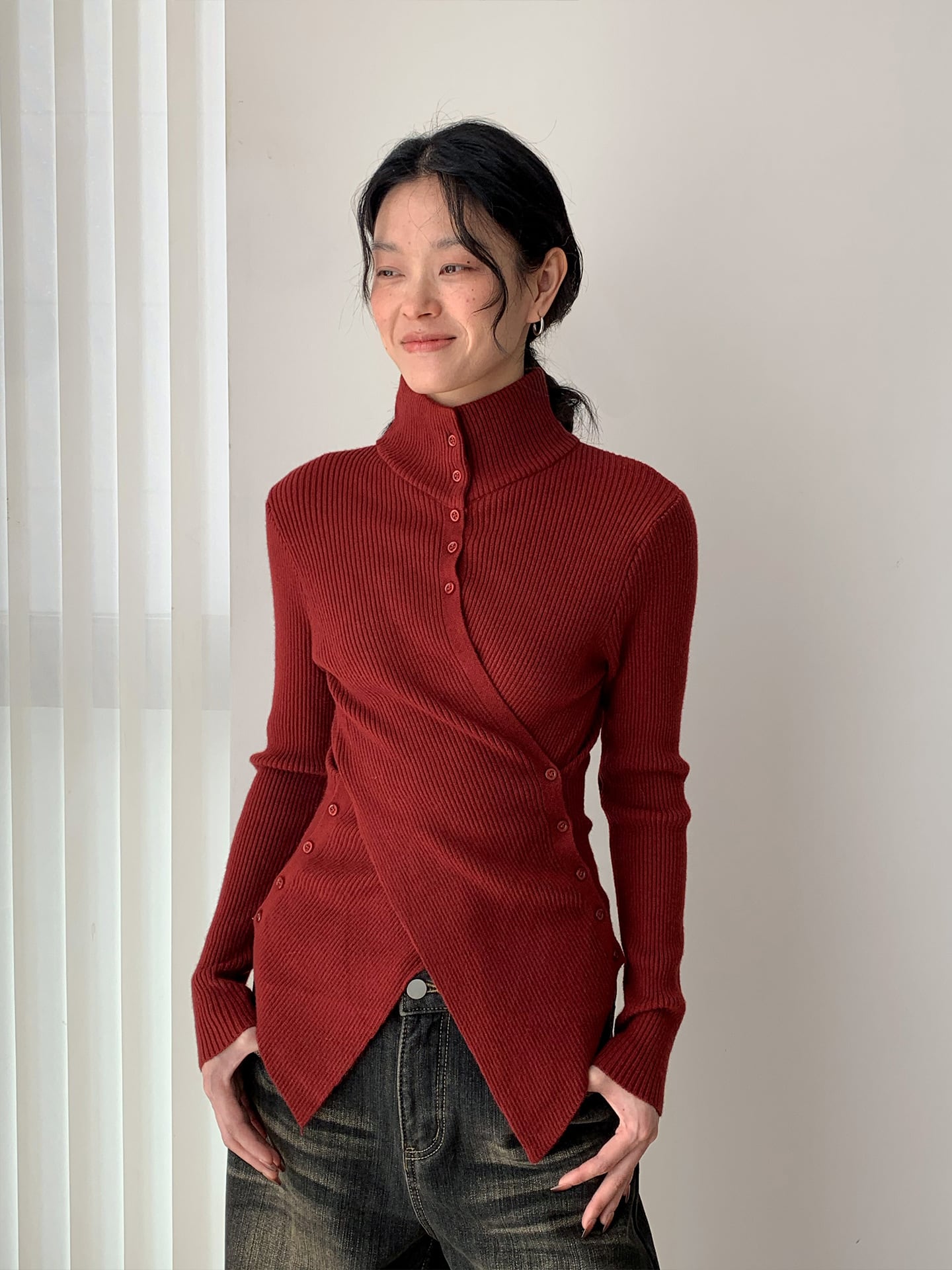 タートルネックとアシンメトリーのボタンデザインが特徴で、シンプルながらもモード感のある上品な印象に仕上げています。