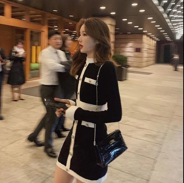 クラシックな配色デザインが魅力の、韓国きれいめバイカラーニットワンピース。