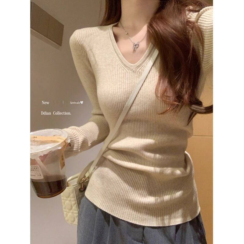 シンプルで上品な印象の韓国きれいめVネックリブニット。