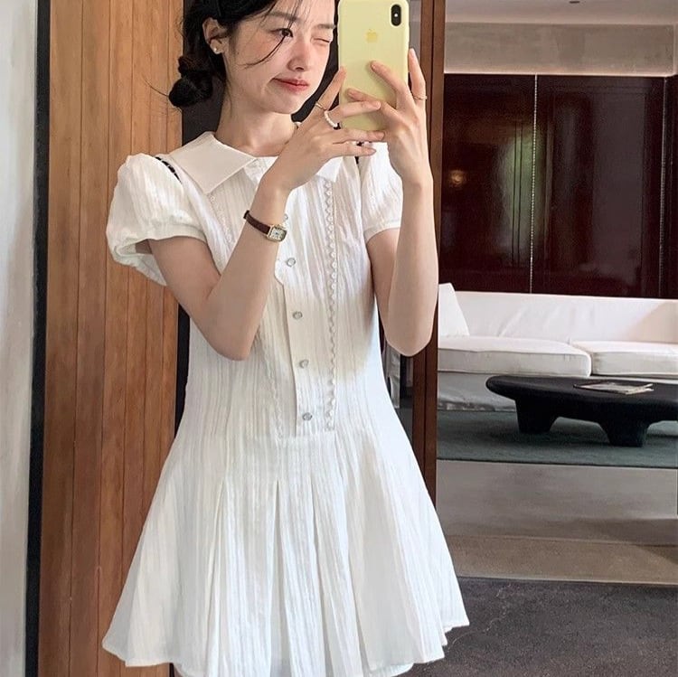襟付きデザインとフロントボタンがきちんと感を演出しつつ、裾に向かって広がるプリーツシルエットで女性らしい印象に仕上がる一枚です。