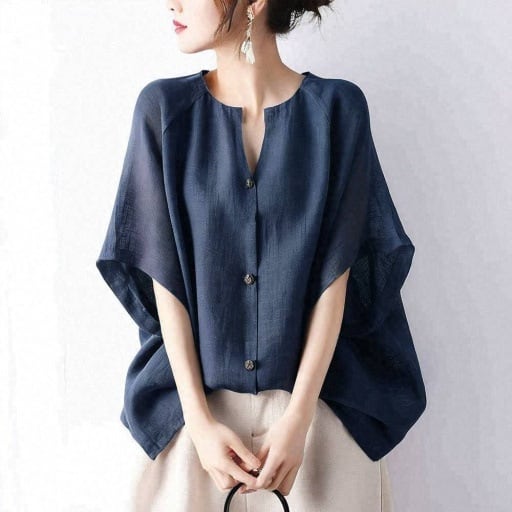 リラックス感がありながらも、フロントボタンのデザインが全体を引き締め、上品な印象に仕上がります。