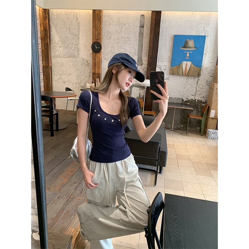 スクエアネックデザインが女性らしい印象を引き立てる、韓国きれいめ半袖トップスです。
