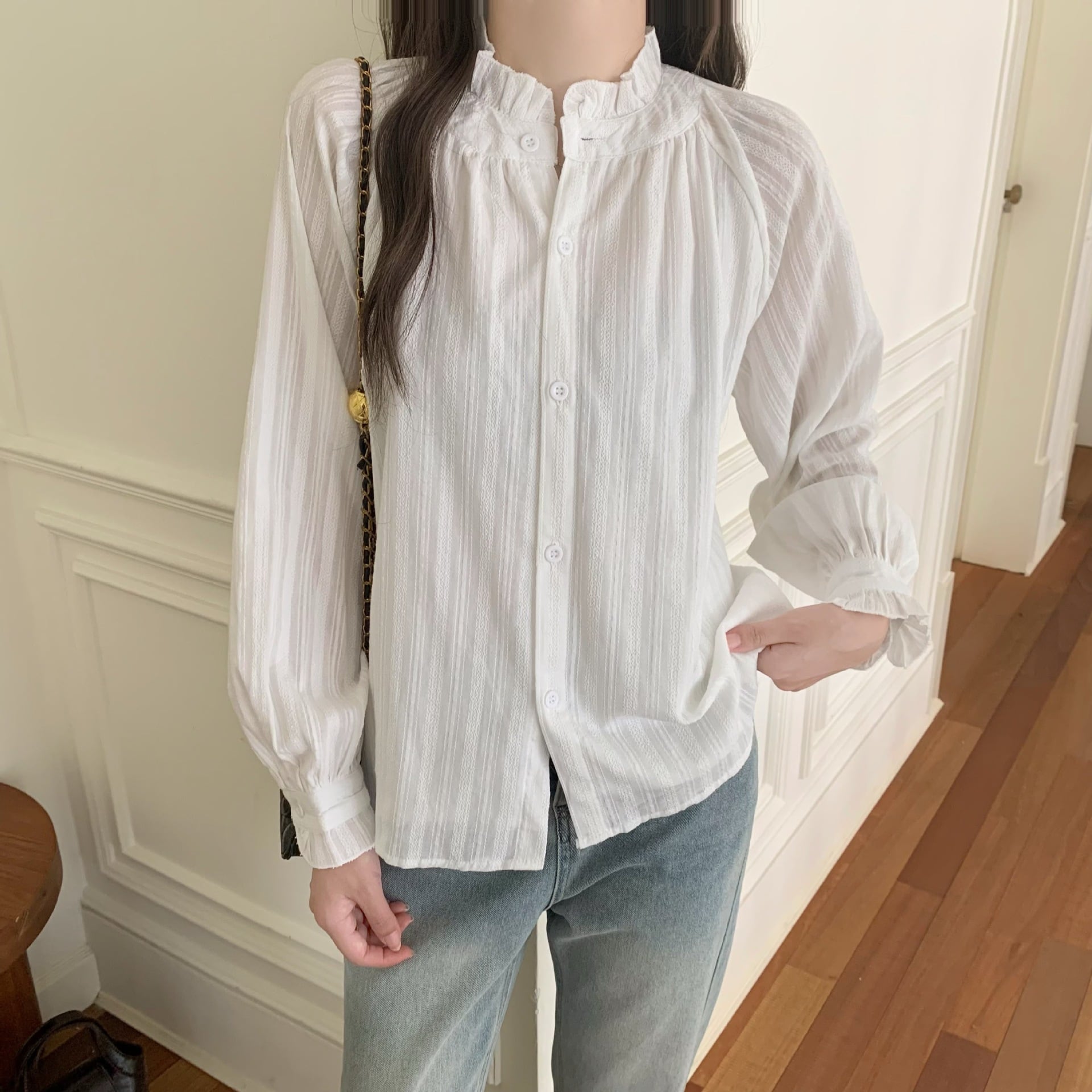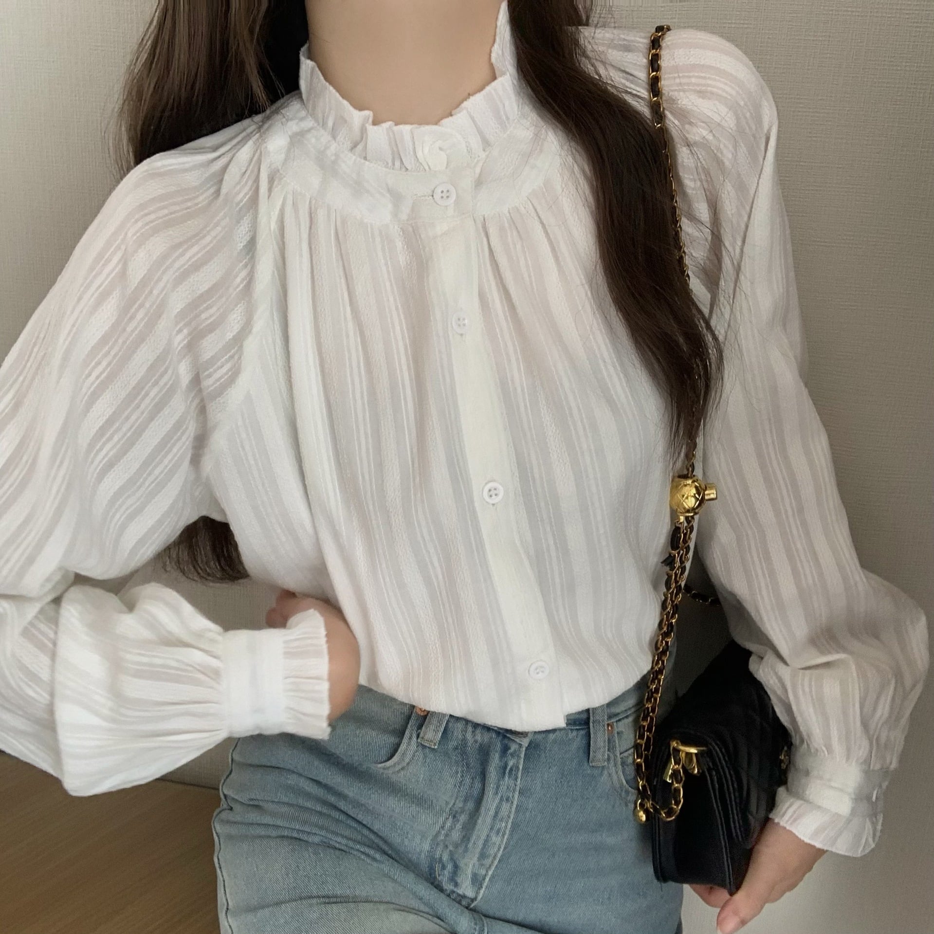 首元の繊細なフリルと、ほんのり透ける軽やかな生地が女性らしさを引き立て、シンプルながら印象に残る1枚に仕上がっています。