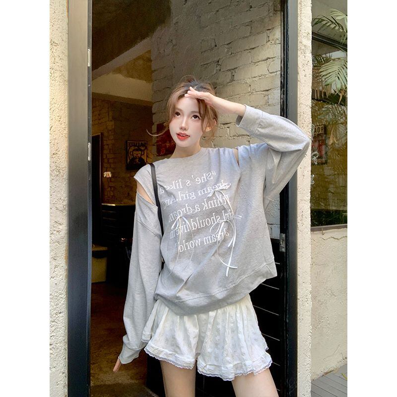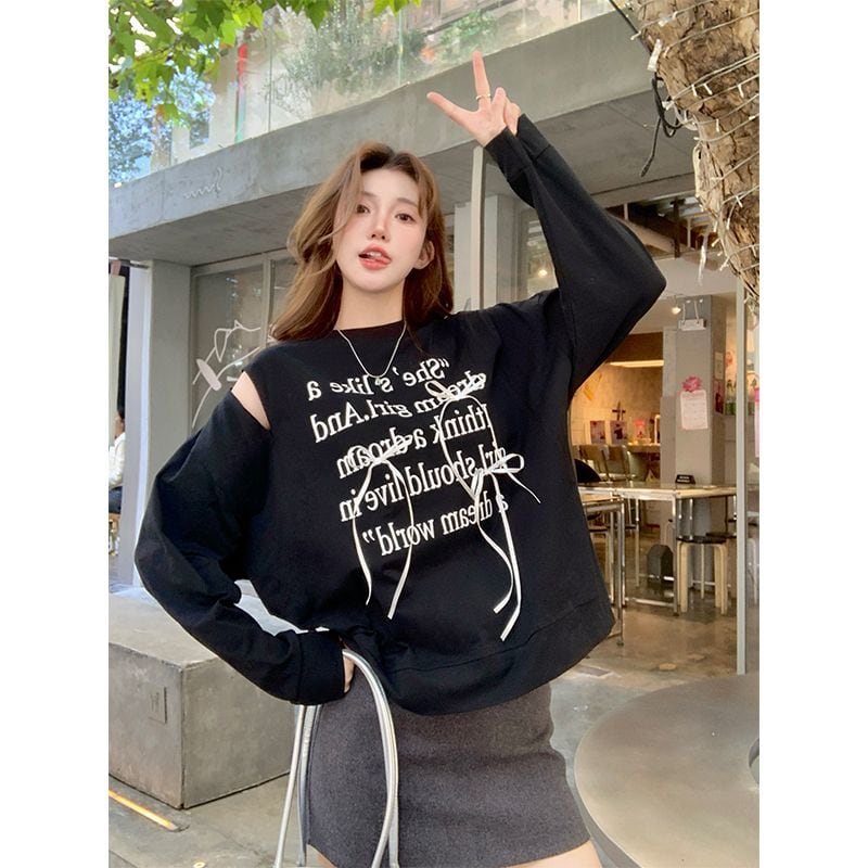 肩あきデザインがアクセントになった、韓国風ロゴスウェット。